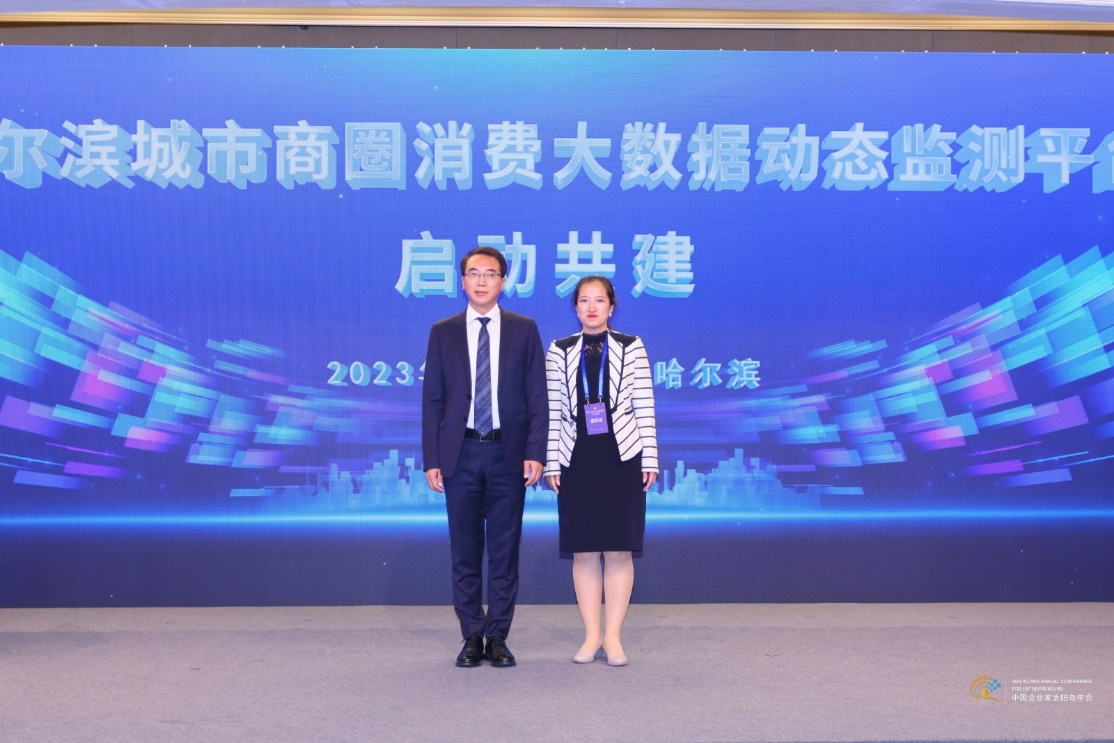 图为哈尔滨市商务局副局长付正艳(右),新华网首席运营官孙巍(左)上台启动共建“哈尔滨城市商圈消费大数据动态监测平台”。