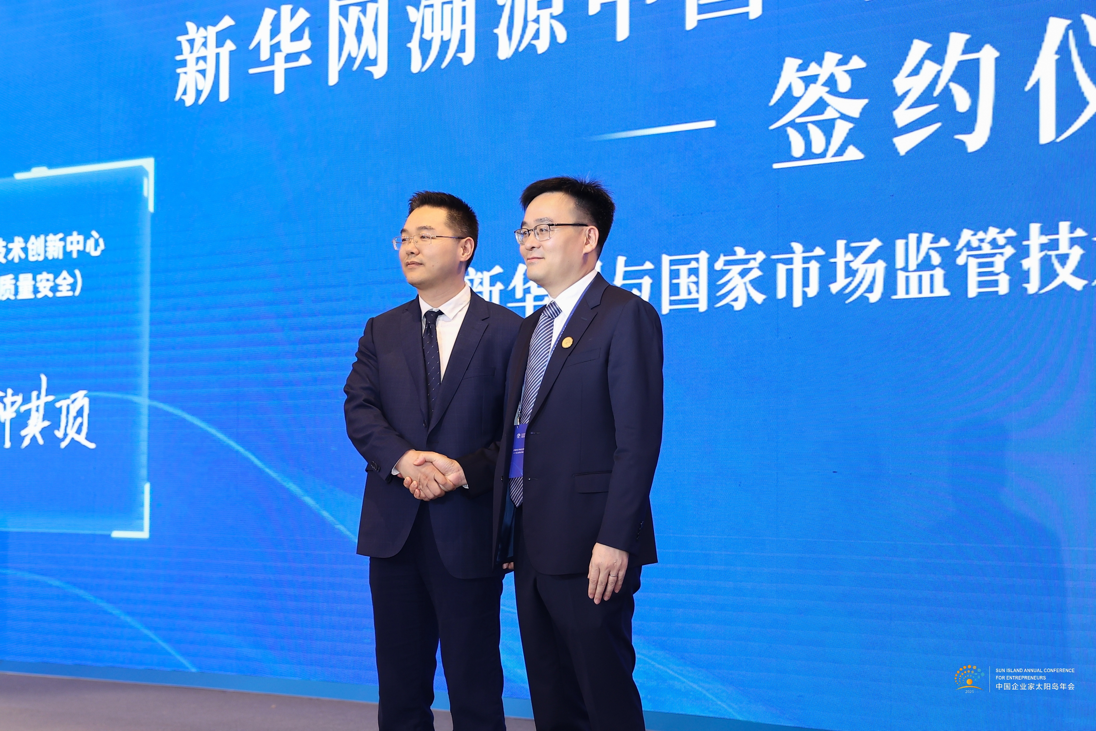 新华网溯源中国种子计划生态合作伙伴签约仪式环节,新华网与国家市场监管技术创新中心合作签约。新华网物联网运营总监兼溯源中国负责人王翔,国家市场监管技术创新中心轻工消费品质量安全执行主任、中国食品科学技术学会食品真实性与溯源分会秘书长钟其顶现场签署合作协议,并合影留念。双方合作,将为食品真实性认证产品提供可信溯源服务,让消费者买得放心,吃得安心。