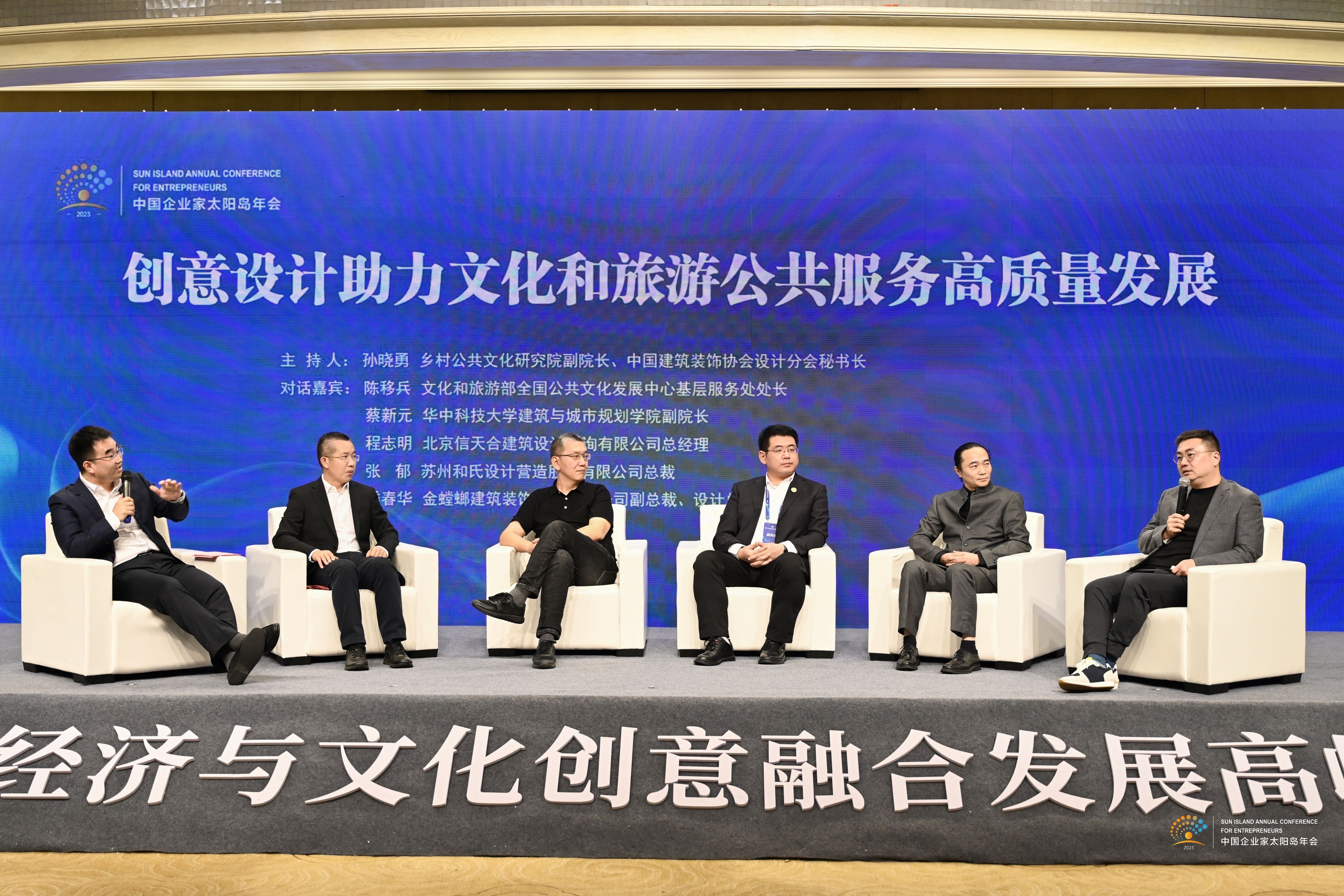 在“创意设计助力文化和旅游公共服务高质量发展”圆桌对话环节,文化和旅游部全国公共文化发展中心基层服务处处长陈移兵,华中科技大学建筑与城市规划学院副院长蔡新元,北京信天合建筑设计咨询有限公司总经理程志明,苏州和氏设计营造股份有限公司总裁张郁,金螳螂建筑装饰股份有限公司副总裁、设计总院执行院长季春华与乡村公共文化研究院副院长、中国建筑装饰协会设计分会秘书长孙晓勇展开精彩对话。