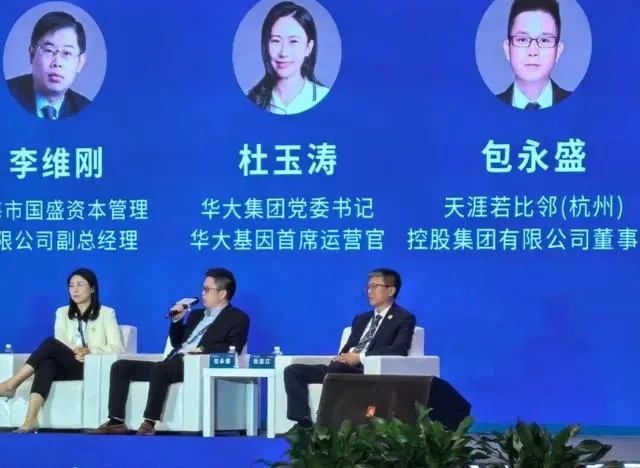 天涯若比邻(杭州)控股集团有限公司董事长包永盛(中)在2023中国企业家太阳岛年会主论坛“思客对话”环节发言