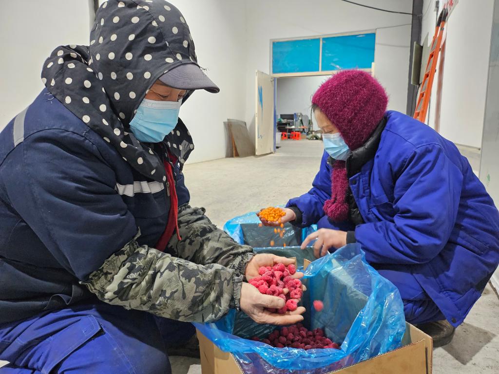 黑龙江禾发农业科技有限公司工作人员在分拣红树莓和沙棘冻果。新华社记者张玥摄
