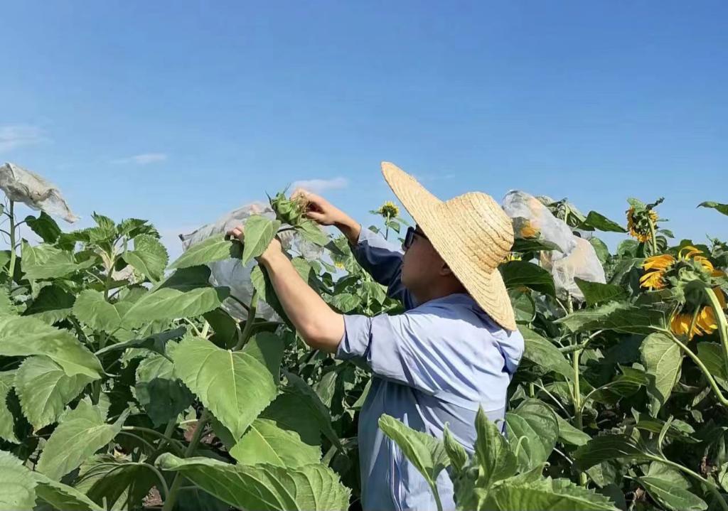 东北农业大学农学院研究生付国裕给试验田里的向日葵套袋。(受访者供图)