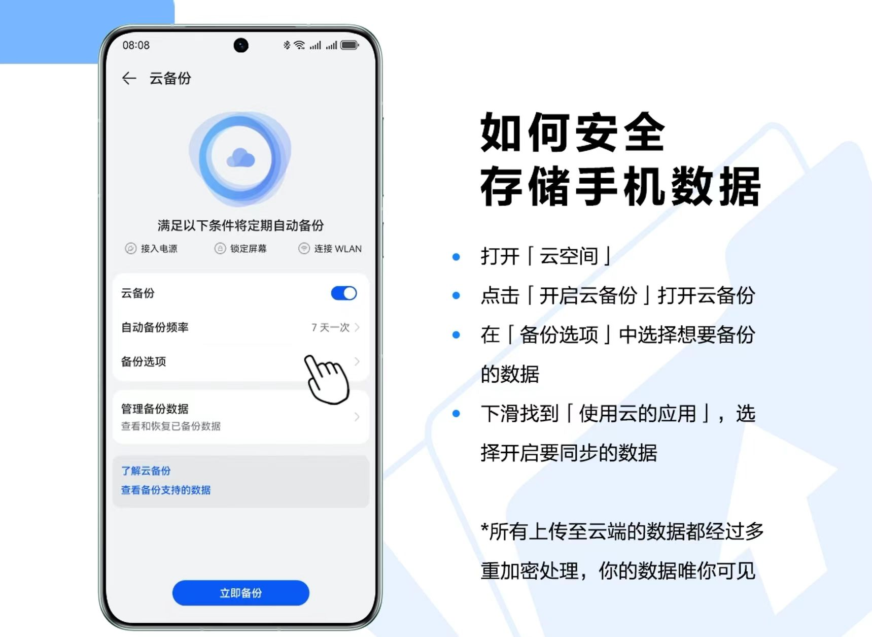 华为云空间通过加密算法,对用户数据进行全流程加密处理。安全存储的同时,也无法被破解或窃取。数据在端侧时,云空间就会对其加密,传输时则采用金融级HTTPS加密通道,确保“路上安全”。而在云端存储时,云空间会先进行多副本备份,避免数据处于“独一份”状态;其次,数据还会在被打散后分别“上锁”,相当于存在不同的保险箱里,守好最后的安全关卡。