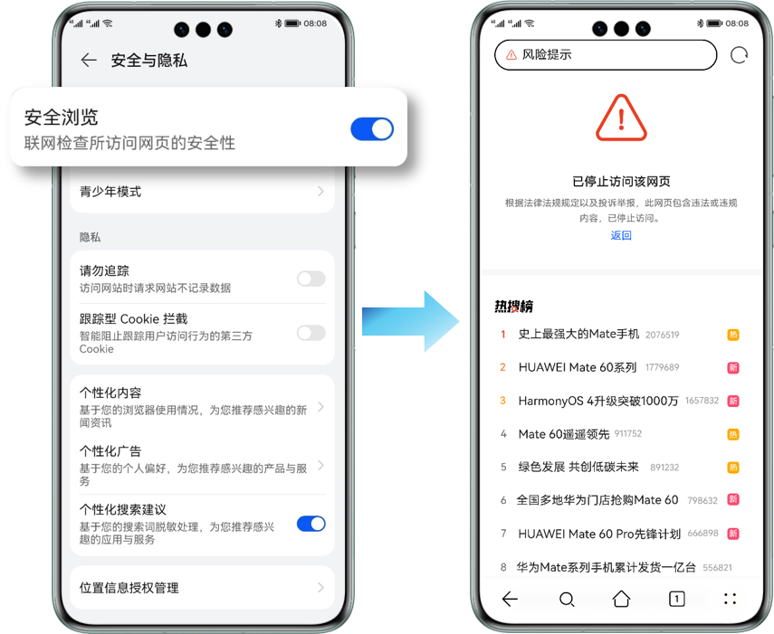 浏览器应用作为我们接触网络信息的重要窗口,在保护隐私安全方面更是责任重大。华为浏览器具备多项业界领先的隐私安全功能,比如“跟踪型Cookie拦截”功能将为你智能阻止跟踪用户访问行为的跟踪型Cookie。而“智能权限管理”功能使得我们可以更加清楚地了解和管理自己在浏览网页时被请求的权限,实现真正的可知可控。例如,当我们浏览招聘网站时,网站会主动请求是否需要授权地理位置信息以获取更精确的工作推荐,既满足了使用需求,同时又不会被索取其他不相关的权限,保障隐私安全。此外,华为浏览器还支持无痕模式、恶意网址检测、广告过滤、智能拦截应用唤起/下载、隐私标签和隐私报告等多种功能,为大家打造一个更加安全的网络浏览环境。