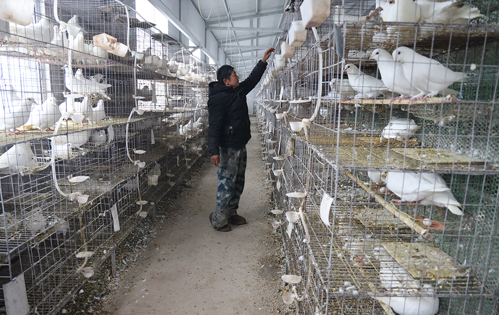 朱金华在鸽舍里查看王鸽生长情况。新华网发 张思来摄