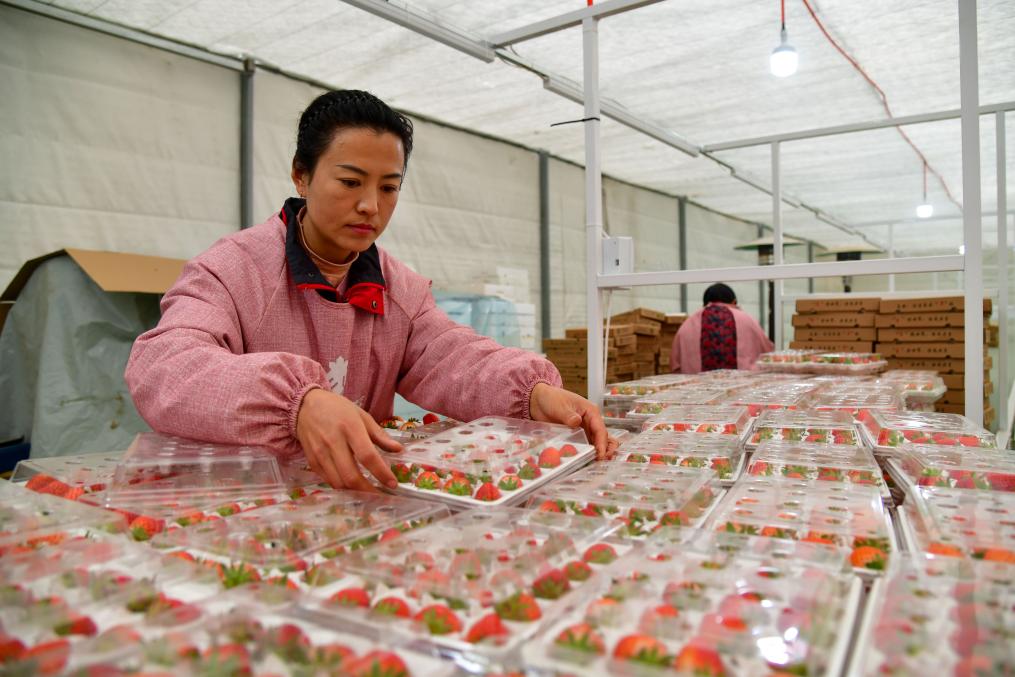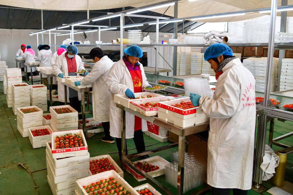 1月15日,在济南市历城区董家街道一处草莓种植园内,员工在分拣包装新鲜草莓