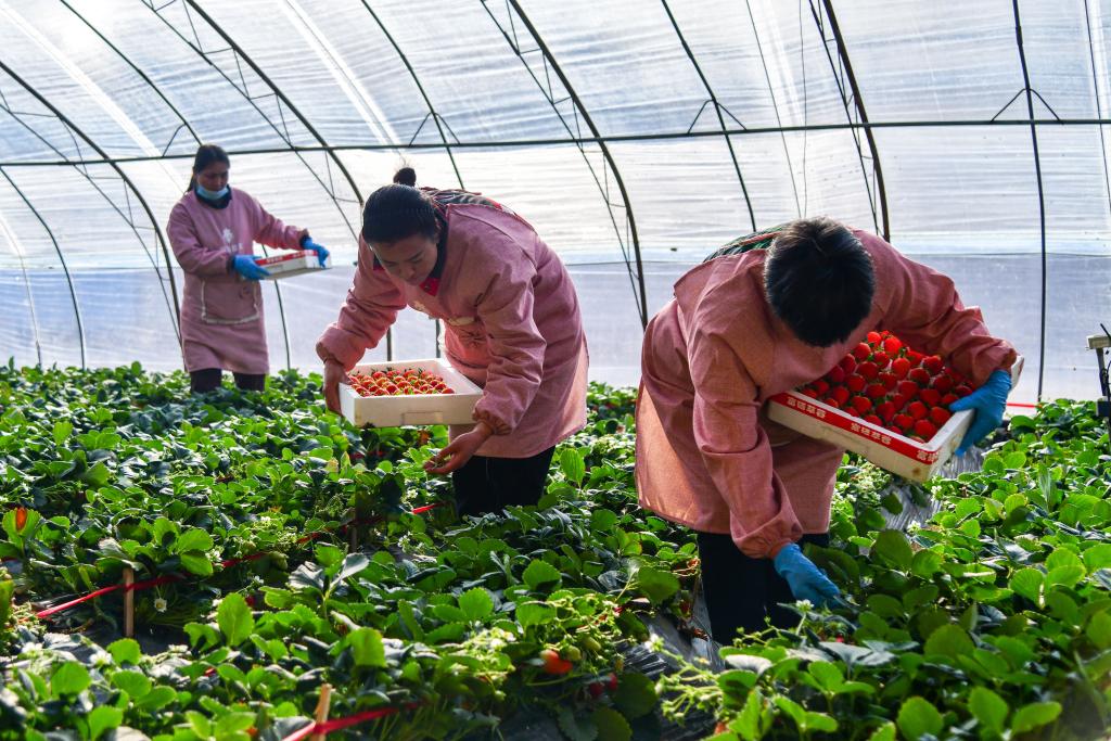 1月15日,在济南市历城区唐王街道一处草莓种植园内,员工在采摘草莓。