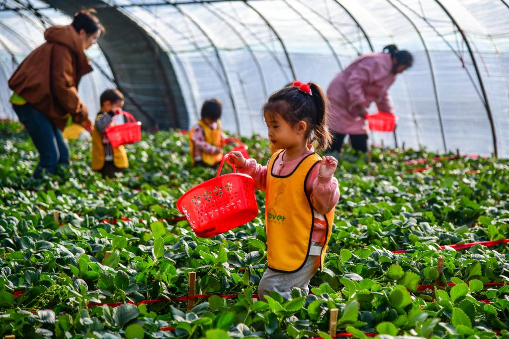 1月15日,在济南市历城区董家街道一处草莓种植园内,前来研学的小朋友在采摘草莓。