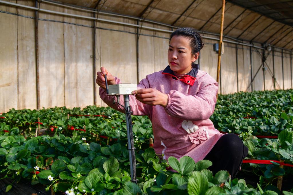 1月15日,在济南市历城区董家街道一处草莓种植园内,员工在检查草莓大棚环境监测设备。