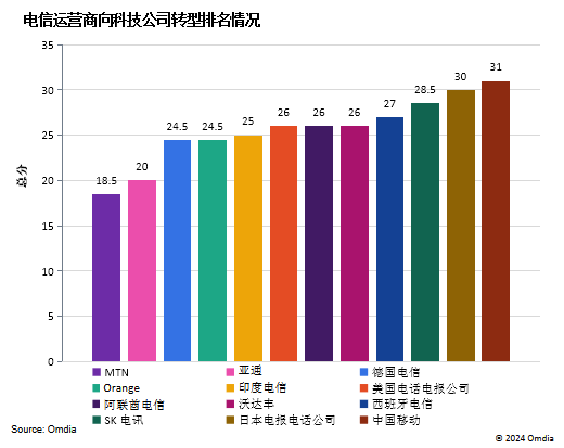 在数字化浪潮席卷全球的今天,数字化转型成为各大企业争相实现的重要任务之一。近日Omdia发布的关于电信运营商向科技公司战略转型的权威报告(以下简称报告),则毫无疑问地吸引了众人关注。中国移动以31的高分(满分40分)荣登榜首,延续了其在2022年和2023年的辉煌成绩,连续三年蝉联第一。