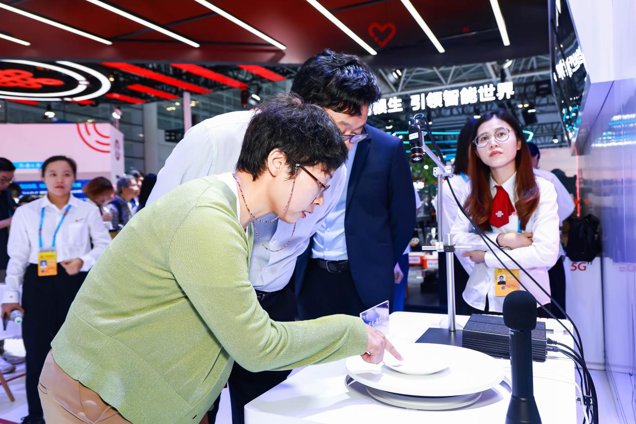 福建泉州德化白瓷以白度好、光泽度高而闻名,中国联通展台现场展示的德化白瓷AI质检,还原了陶瓷瑕疵品AI检测过程——陶瓷样品在展台旋转,经工业相机拍摄、AI算法识别检测,瑕疵检测结果即可实时展现。
