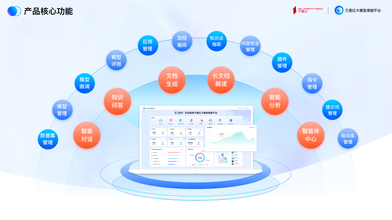 在此次大会上,万里红首次展出了大模型使能平台,该平台是一款专为垂直行业客户打造的大模型应用构建和业务赋能平台,具备大模型智能对话、知识库智能问答、文档自动生成、数据智能分析等功能,预置若干成熟商用大模型和业务应用,支持多种本地化信创环境离线部署和使用,实现私域沉淀知识的价值挖掘,以及行业专有数据的深度应用和业务创新。