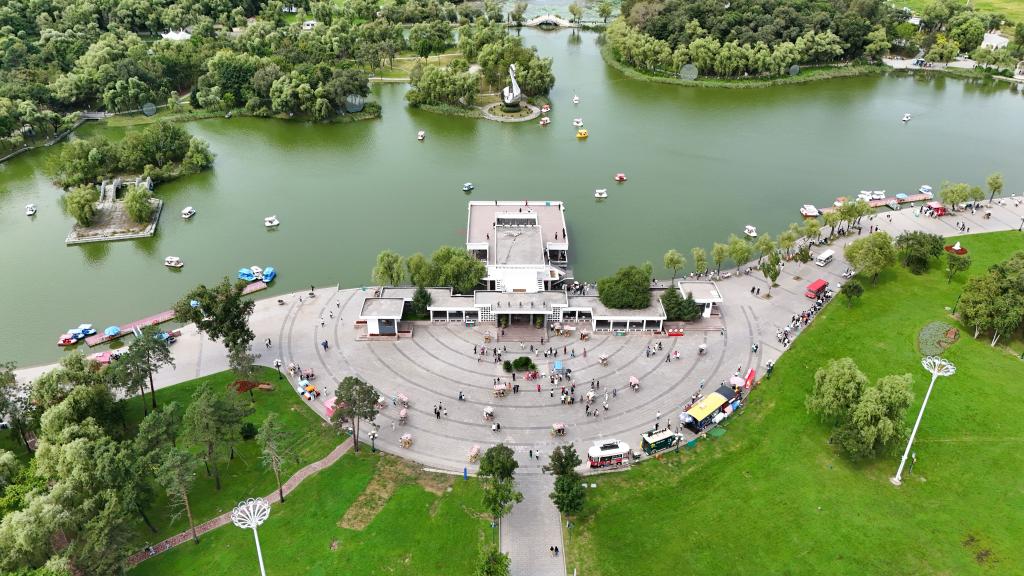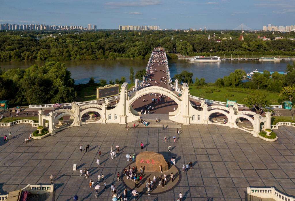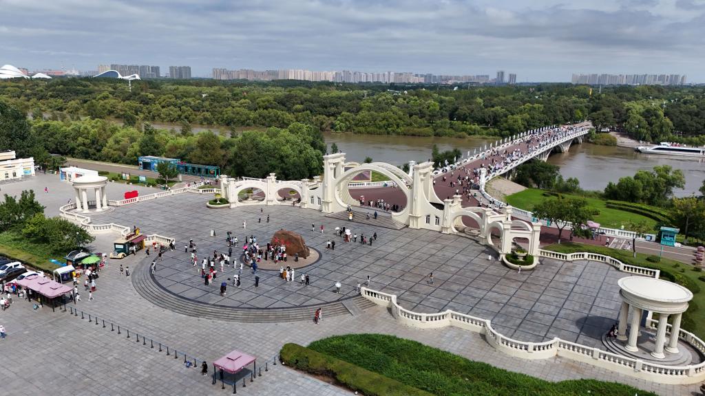 8月20日,游人在太阳岛风景区太阳石广场留影(无人机照片)。