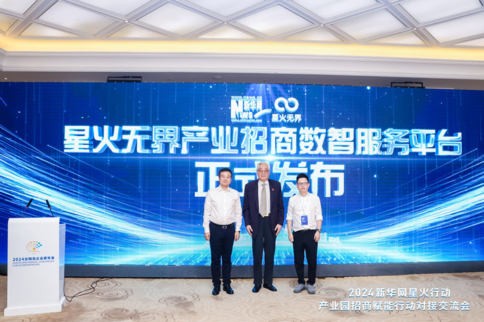 原国务院国有重点大型企业监事会主席谢钟毓与新华网首席信息官姚予疆、天涯若比邻(杭州)控股集团董事长包永盛共同发布“星火无界产业招商数智服务平台”。
