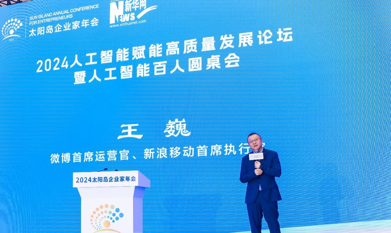 新华网北京8月26日电(赵海军)8月22日-24日,2024太阳岛企业家年会在哈尔滨举行,来自政产学研用领域超千位嘉宾出席大会,并聚焦新质生产力展开了深入的交流与思想碰撞。微博COO、新浪移动CEO王巍出席,并在人工智能赋能高质量发展论坛暨人工智能百人圆桌会上发表了主题为《大模型崛起——人工智能+赋能企业高质量发展》的演讲,分享了人工智能赋能企业高质量发展中的引擎作用。