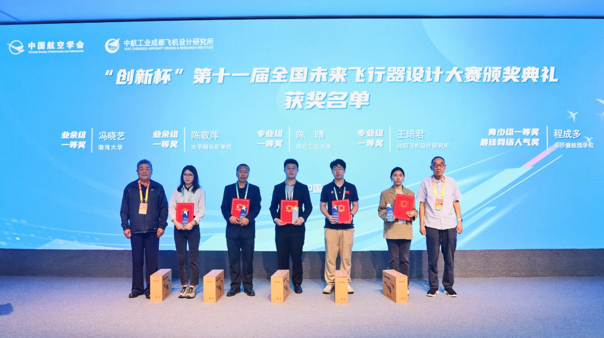 航空工业成都飞机设计研究所党委书记张剑龙宣布获奖人员名单,中国航空学会名誉理事长刘高倬和海军原副司令员张永义共同为获奖作品代表颁发证书、奖杯及奖品。