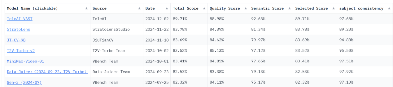 得益于VAST的创新能力,视频生成大模型可以保证单个或多个主体人物在各视频片段中的外观一致性,实现对复杂动作和交互式动作的精确控制,并让角色和目标物体的运动符合物理规律。基于此,通过语义、语音、文生图、文生视频等全栈大模型能力打通短剧及影视制作的各个环节,覆盖文字脚本撰写、分镜脚本绘制、视频拍摄及剪辑、配音及音效合成等全流程,实现降本增效。目前,TeleAI视频生成大模型在权威视频生成评测榜单VBench中排名第一。