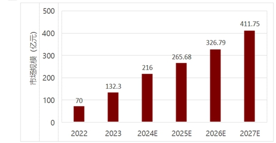 赛迪四川在《2024AI大模型行业调查研究报告》(以下简称:《报告》)中分析认为,我国通用大模型市场规模在2022年约为70亿元,2023年突破130亿元,预计到2027年将突破400亿元,年均增速超25%。《报告》指出,随着未来产业基础建设持续 增长、大模型应用替换、生成式人工智能带来的增量市场和人工智能赋能的企业级应用拓展,通用大模型市场将逐渐成熟。