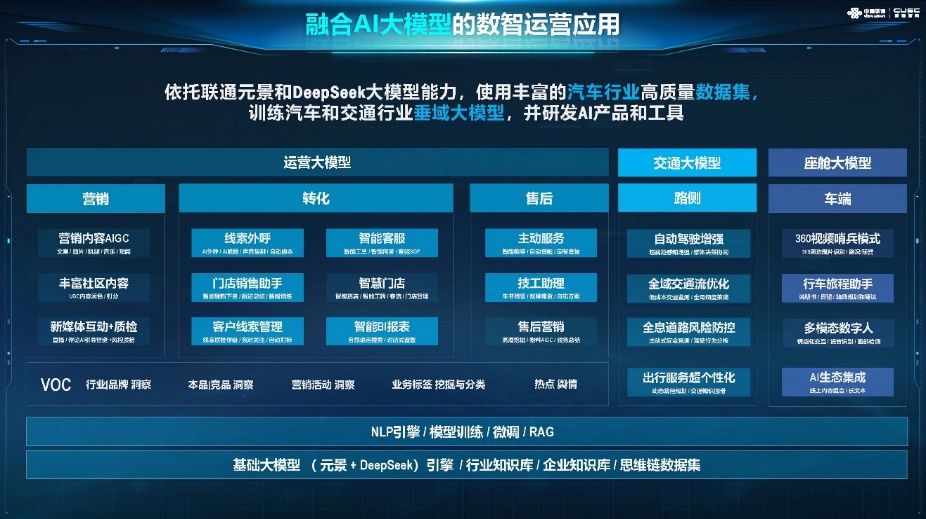 依托联通“元景”和DeepSeek大模型能力,联通智网科技结合十年积累的汽车行业数据以及具体场景,训练出运营大模型、座舱大模型、交通大模型,为车企提质增效,提升车主出行体验。数据显示,AI大模型综合应用可帮助车企整体提升28%人效比。