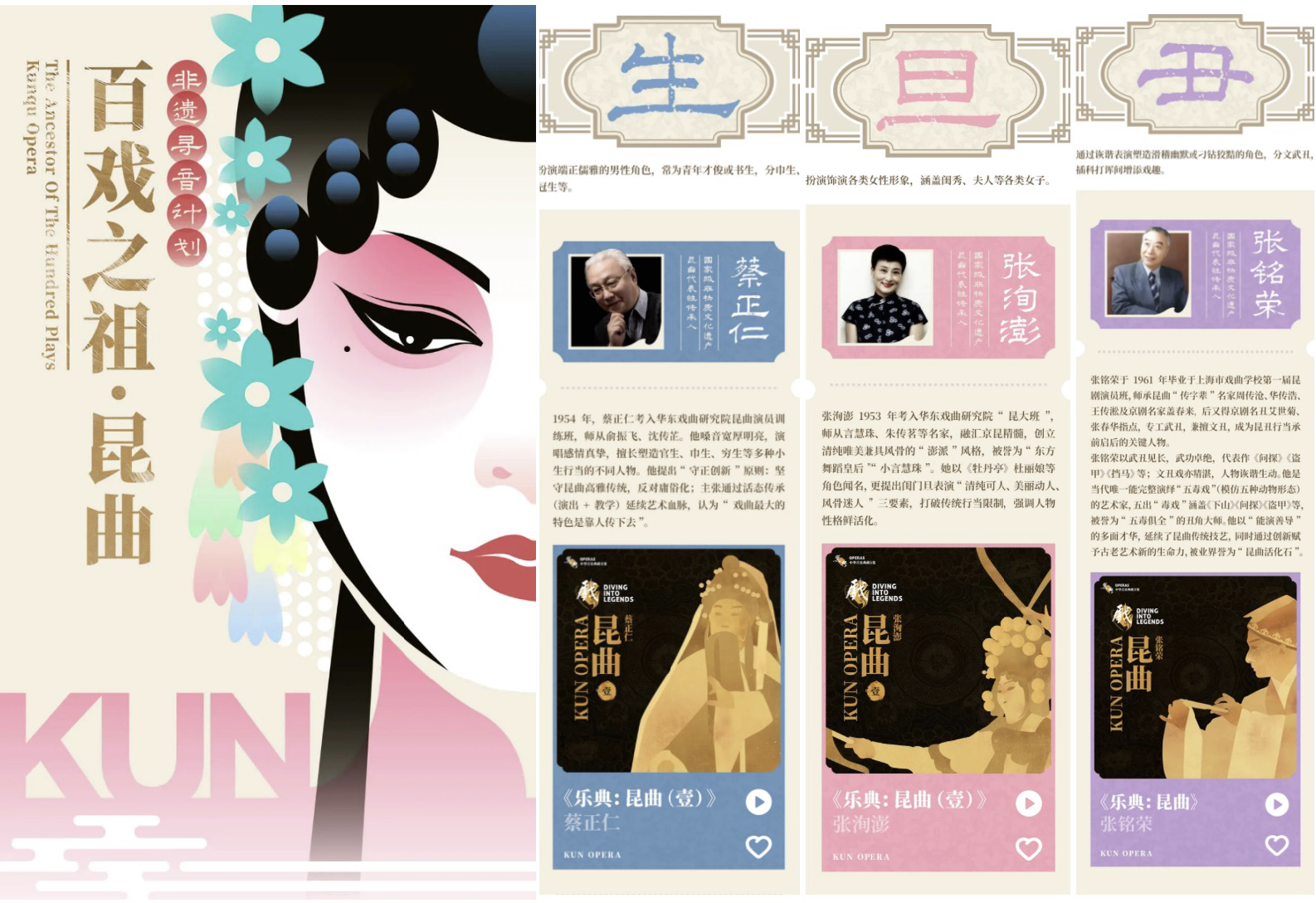 第二期“百戏之祖·昆曲”则走进最古老的剧种之一“昆曲”, 通过“生、旦、净、末、丑”等几大版块甄选带听众走进如梦如幻的昆曲世界,感受蔡正仁、张洵澎、方洋、计镇华、张铭荣等戏曲名家的艺术唱腔。官生、巾生、穷生等人物宽厚明亮的真挚演唱,鲜活动人的闺门旦之音,幽默诙谐的生动五毒戏演绎,这些都可通过华为音乐超高清、空间音频等一键开启沉浸式聆听。