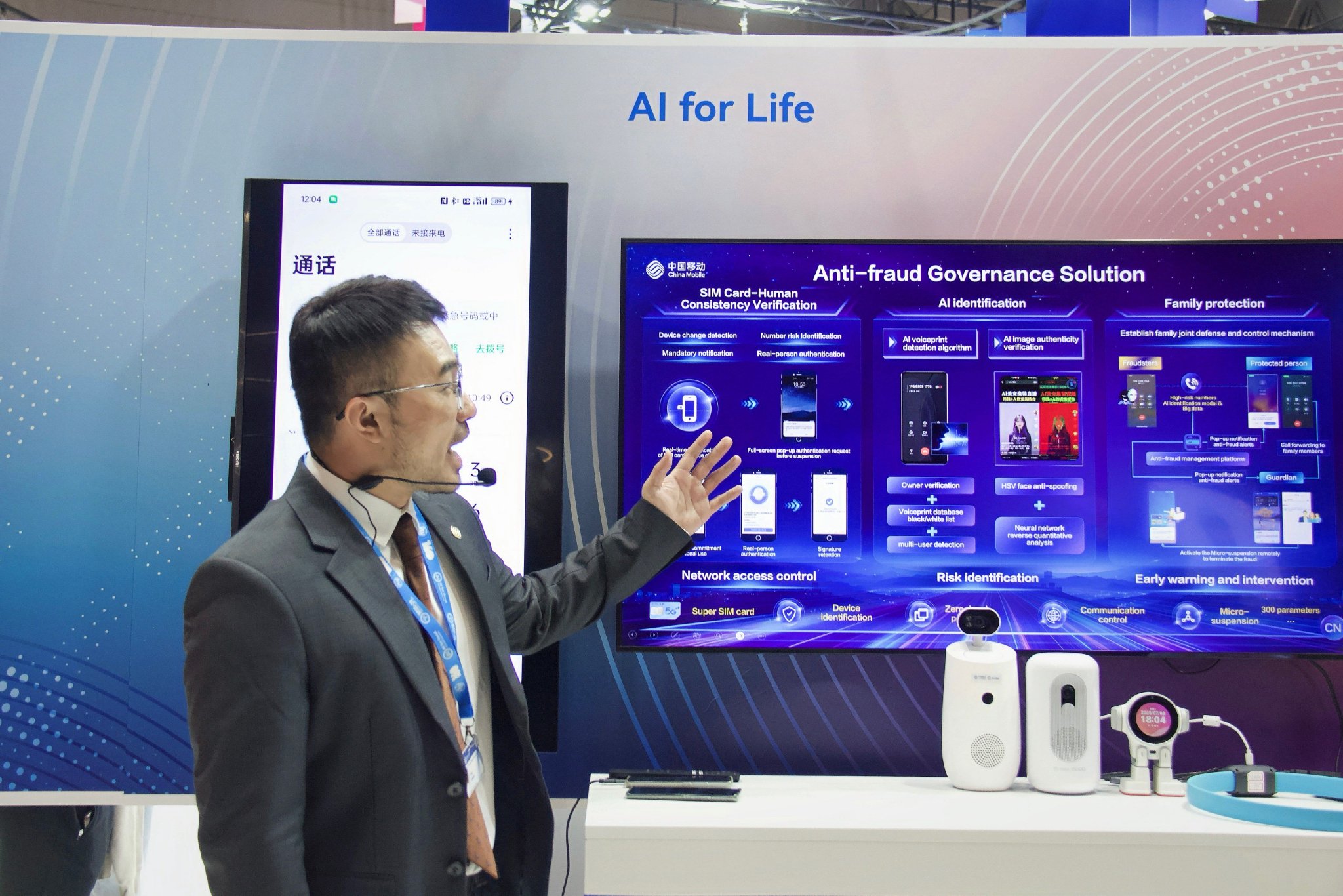 走进“Al for生活”展区,中国移动创新推出的AI新通话、同声传译、A1来电守护、Al+智慧家庭一体化解决方案等产品应用,吸引了许多观众驻足体验。融合5G新通话及5G信息能力,AI新通话为用户打造了“通信即服务”的智能入口。用户可在通话中一键调起同声传译服务,实现与国际友人的无障碍沟通;还可体验实时转写、通话摘要、通话表情分享等服务,让沟通更便捷、更有趣。面对疑似诈骗来电,“AI来电守护”可智能识别风险,及时发送预警、插播语音提醒甚至远程微停机,守护财产安全。此外,DC新通话(Data Channel,数据通道)让用户拨打酒店电话即可完成房间预订等网络交互操作,让AI真正成为触手可及的生活助手。