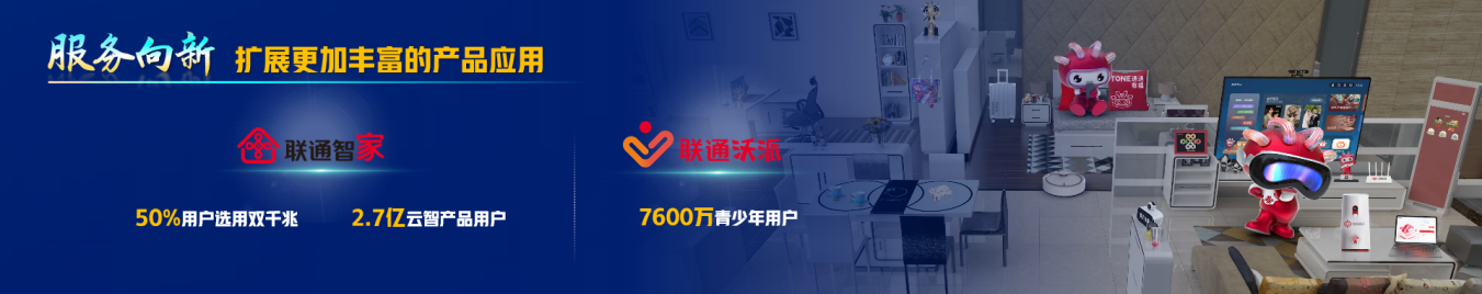 提升产品服务品质,丰富数智生活场景,为广大客户提供更好的体验。50%的联通用户选用“双千兆”服务,联通超清、联通看家、云智手机和“智家通通”机器人等产品服务2.7亿用户,“联通智家”生态更加壮大。“联通沃派”品牌深入人心,叠加丰富的特色权益、专属服务和融合应用,满足7000多万青少年个性化需求。