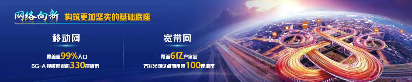 推进移动网络从5G到5G-A、宽带网络从千兆到万兆的向新升级,以更广的连接、更快的速率、更宽的上行、更低的时延、更准的感知,联接AI深入更多场景,催生更多应用。