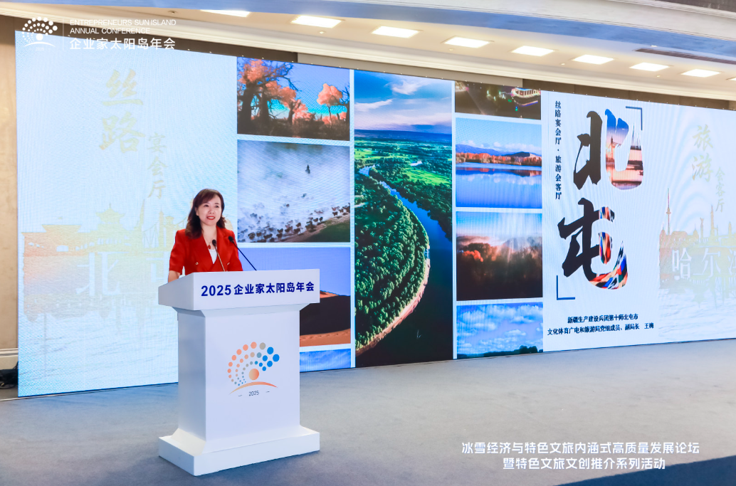 8月2日,2025太阳岛企业家年会“冰雪赋能发展 文旅创引未来”冰雪经济与特色文旅内涵式高质量发展论坛在哈尔滨举行。图为北屯市文化体育广电和旅游局王梅作北屯市文旅城市推介