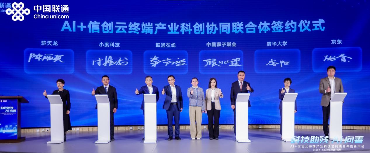 会上,“AI+信创云终端产业科创协同联合体签约仪式”顺利举行,联通在线与清华大学、京东、中国狮子联会、上海小度科技、楚天龙等5家成员单位代表共同签约。这标志着科技助残生态体系进一步完善,整合了“政产学研服用”各方优势资源,形成了覆盖“云网边端芯”全链条的协同闭环。