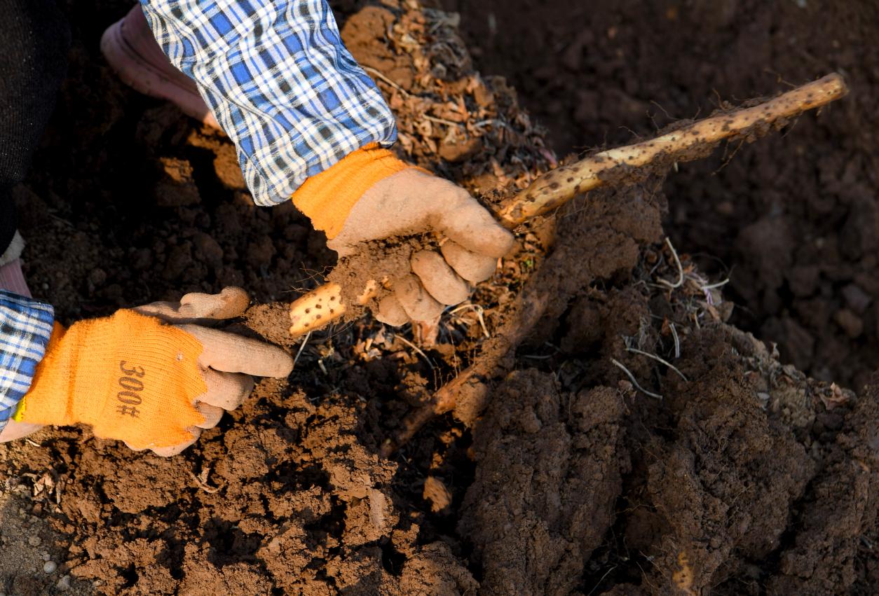河南省焦作市温县祥云镇关肇村农民在田间收获铁棍山药。新华社记者郝源 摄