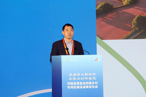 图为潢川县委副书记、县长黄在国在河南宜居宜业和美乡村先导区建设成果发布会上发言