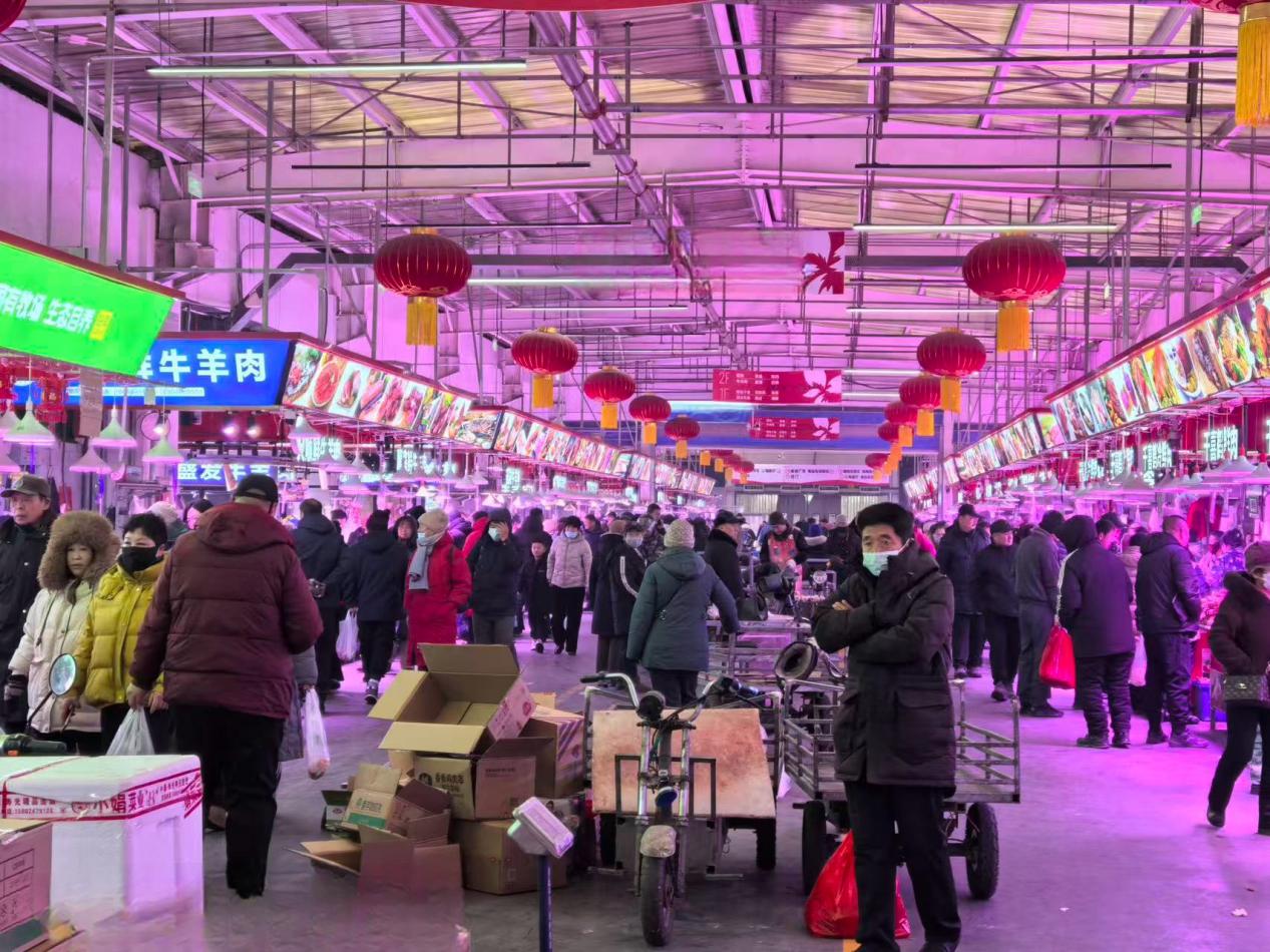 作为城市供应的“大动脉”,沈阳各大批发市场早已进入春节保供的繁忙节奏。沈阳雨润农产品批发市场负责人陈初表示,当前市场蔬菜日吞吐量稳定在800吨左右,猪肉日均供应约400头,牛羊肉及各类水产海鲜供应充足、品类齐全。为保障供应高效稳定,市场依托全国直采基地进一步拓宽货源渠道,利用大型仓储设施科学调控库存,同时构建完善的应急调运体系,全力应对各类突发情况。此外,市场在近期全新开办的沈北雨润大集,增设了各类年货食品和春节装饰用品临时摊位,切实满足市民一站式购齐年货的需求。