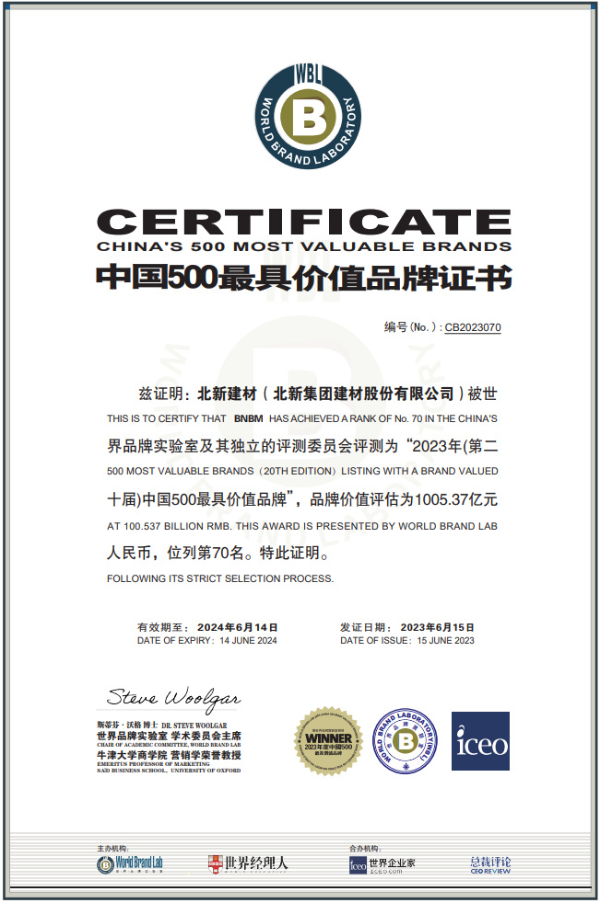 6月15日,世界品牌实验室(World Brand Lab)发布了2023年度《中国500最具价值品牌》排行榜。北新建材品牌价值再创新高,以品牌价值1005.37亿元,位列中国500最具价值品牌第70位。北新涂料以48.36亿元的品牌价值进入榜单。