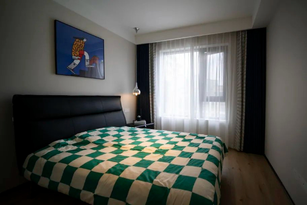 儿童房以黑白色调为主,绿色棋盘格床品搭配金属吊灯、旋转式床头柜,打造时尚摩登的生活空间。
