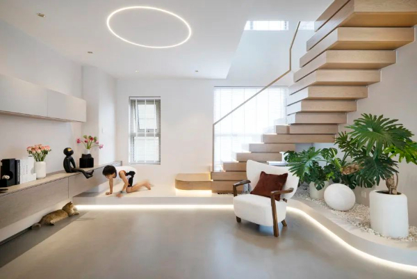 楼梯采用悬浮式设计,底部打造为小花园,让空间充满生机。同时,在原始休闲区的基础上增加收纳柜,打造多功能空间,可以作为孩子的玩耍区,也可以作为读书角。