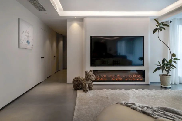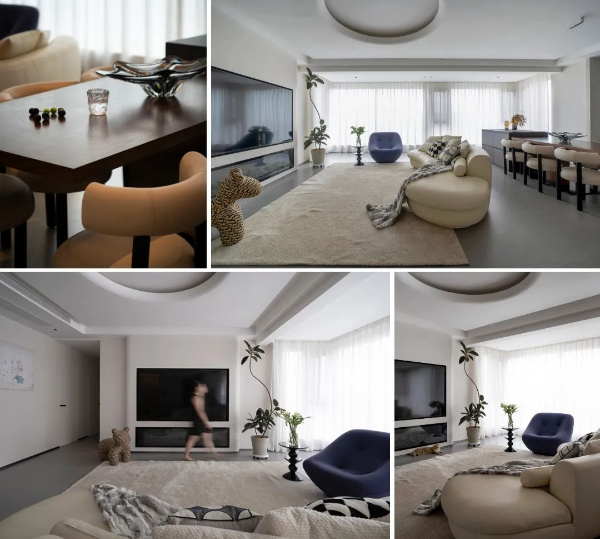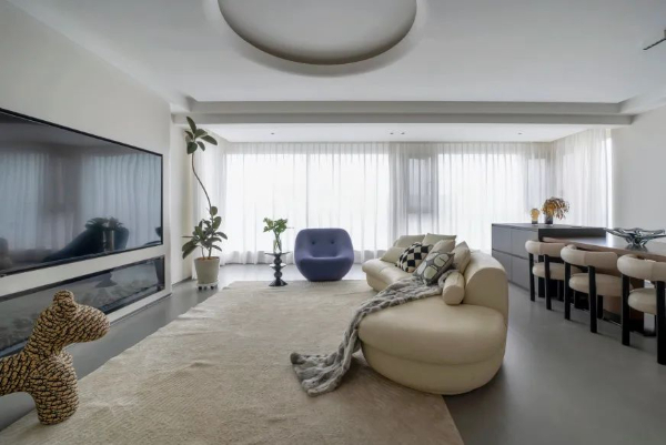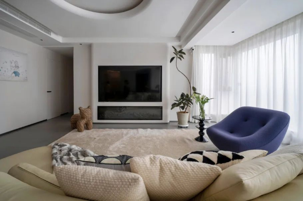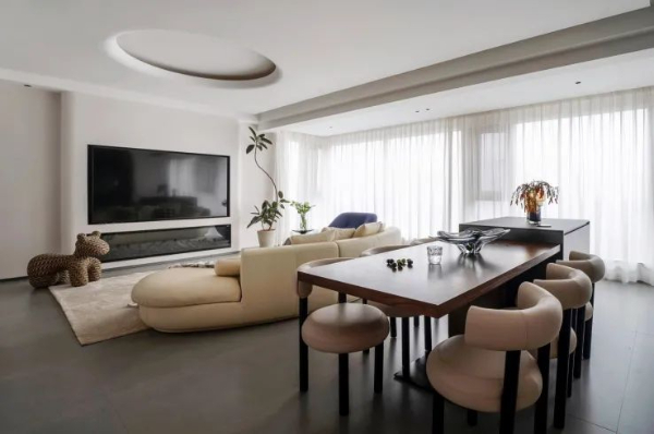 背景墙采用弧面设计,与弧形吊顶相呼应,嵌入式电视彰显简约调性,全屋采用无主灯设计,层层递进的氛围灯让空间富有层次感。