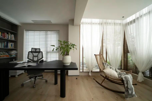 书房以极简为主,分为工作区和休息区,玻璃书柜在自然光的映衬下将空间变通透,百叶窗搭配薄纱窗帘,随风而动,营造宁静悠扬的氛围。