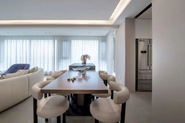 阳台和客厅之间的墙体,使空间更开敞,提升采光。餐厅使用岛台加大长桌的设计,增加了家人间的互动。