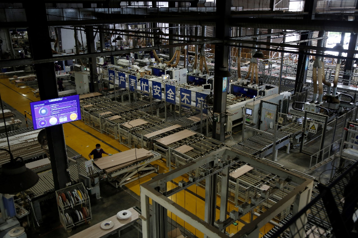 在尚品宅配的生产车间,产业工人们也正在有条不紊地进行生产。