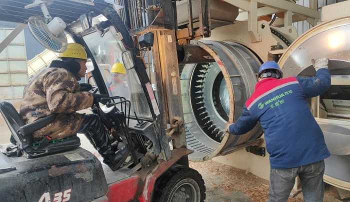 在万华生态,工人们早已站在流水线前,调试着机器的每一个零件。生产线上大型连续平压秸秆板生产线的启动、绿色板材成品的质检抽检、工业互联网数控中心的实时监测......