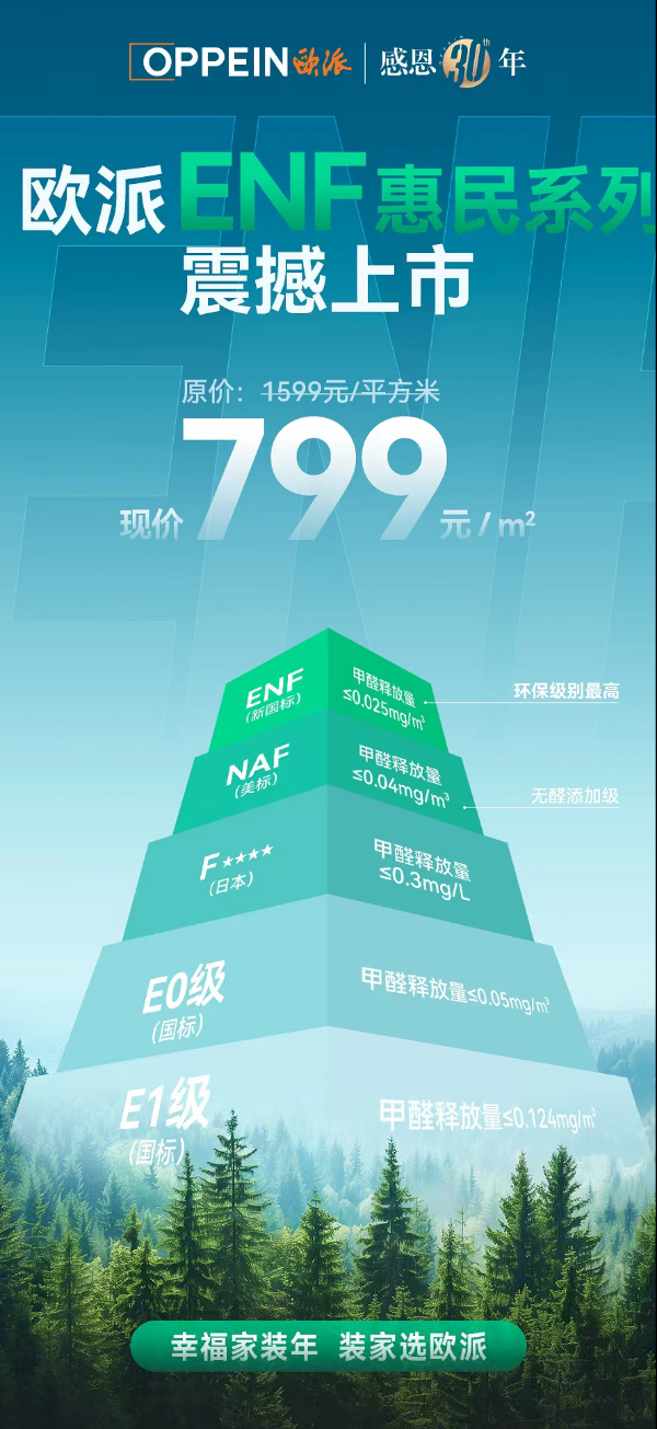 据悉,欧派ENF级净醛抗菌爱芯板,采用专利净醛技术,更进一步净化空间甲醛。爱芯板引领行业环保标杆。不仅基材无醛添加,更有专利净醛涂层,能自动吸收并分解室内空气中的甲醛,基材无醛、净醛、抗菌、防霉、净TVOC,5重防护,实力构建健康堡垒。