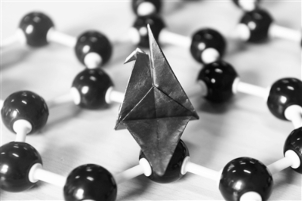 图为浙江大学研究人员用新型柔性石墨烯膜折叠的千纸鹤和柔性石墨烯膜分子结构模型。 龙巍/视觉中国