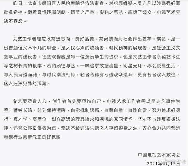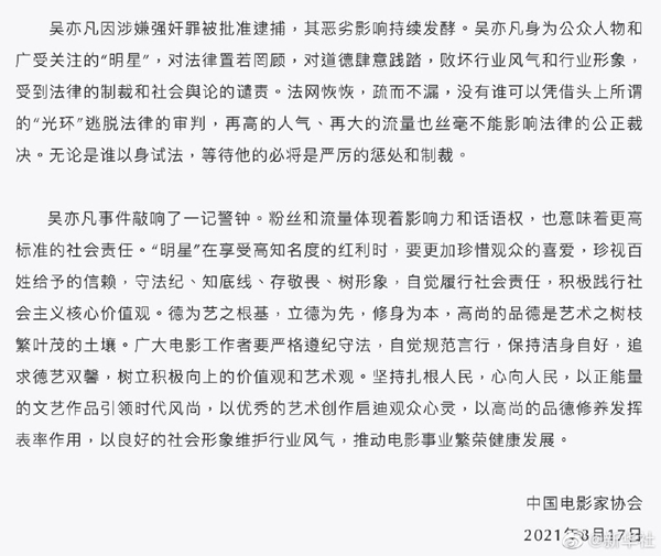 中国电影家协会、中国音乐家协会、中国电视艺术家协会17日分别就吴亦凡被批捕事件发声。中国影协表示,再高的人气、再大的流量也丝毫不能影响法律的公正裁决。无论是谁以身试法,等待他的必将是严厉的惩处和制裁。中国音协表示,任何劣迹艺人在健康有序的行业生态里都将毫无喘息之隙,对于违法违纪、失德失范艺人,我们将持续予以抵制。中国视协表示,坚决不与违反道德法律、违背公序良俗者为伍,坚决不给违法失德之人存留容身之处,齐心合力共同营造电视行业风清气正良好氛围。(记者王鹏)