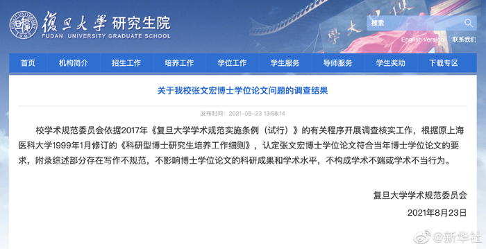 记者23日从复旦大学获悉,复旦大学学术规范委员会依据2017年《复旦大学学术规范实施条例(试行)》的有关程序开展调查核实工作,根据原上海医科大学1999年1月修订的《科研型博士研究生培养工作细则》,认定张文宏博士学位论文符合当年博士学位论文的要求,附录综述部分存在写作不规范,不影响博士学位论文的科研成果和学术水平,不构成学术不端或学术不当行为。(记者吴振东)
