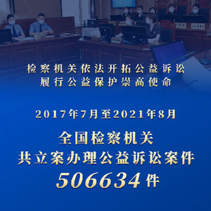 最高人民检察院22日发布统计数据显示,从2017年7月1日公益诉讼检察工作全面推开至今年8月,全国检察机关共立案办理公益诉讼案件506634件,其中,民事公益诉讼37673件,行政公益诉讼468961件。检察机关坚持把诉前实现维护公益目的作为最佳司法状态,共发出诉前检察建议408997件,行政机关回复整改率98.53%。(记者刘硕,海报设计杨轶群)