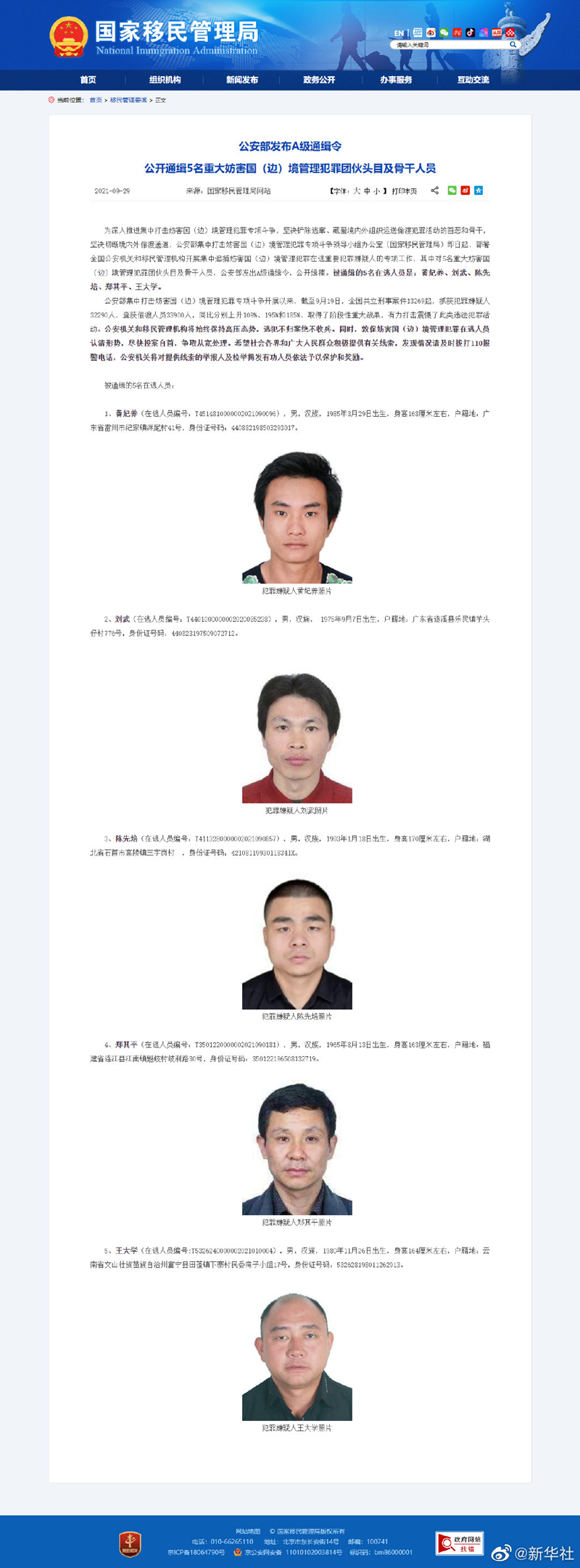 记者29日从国家移民管理局获悉,公安部集中打击妨害国(边)境管理犯罪专项斗争领导小组办公室(国家移民管理局)即日起,部署全国公安机关和移民管理机构开展集中追捕妨害国(边)境管理犯罪在逃重要犯罪嫌疑人的专项工作,其中对5名重大妨害国(边)境管理犯罪团伙头目及骨干人员,公安部发出A级通缉令,公开缉捕。被通缉的5名在逃人员是:黄妃养、刘武、陈先培、郑其平、王大学。