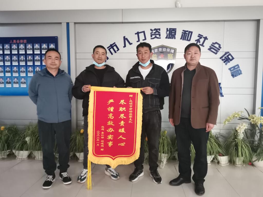 2022年1月10日,两位农民工向帮助其讨薪的昆明市劳动监察支队送来锦旗。(云南省人力资源和社会保障厅供图)