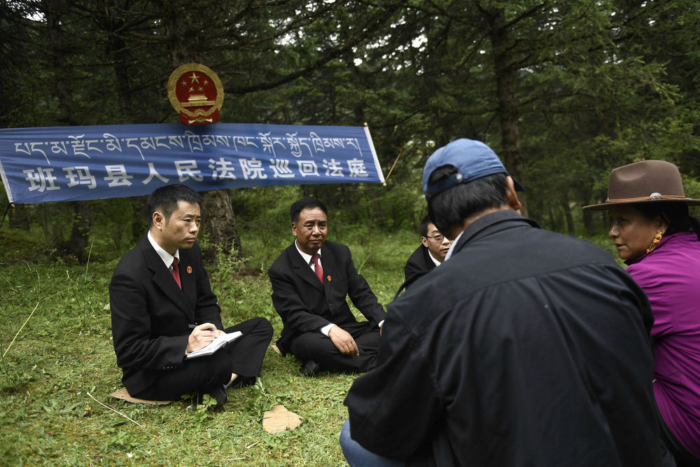 ↑ 2021年8月7日,青海省果洛藏族自治州班玛县人民法院工作人员在解答当地牧民群众的法律咨询。