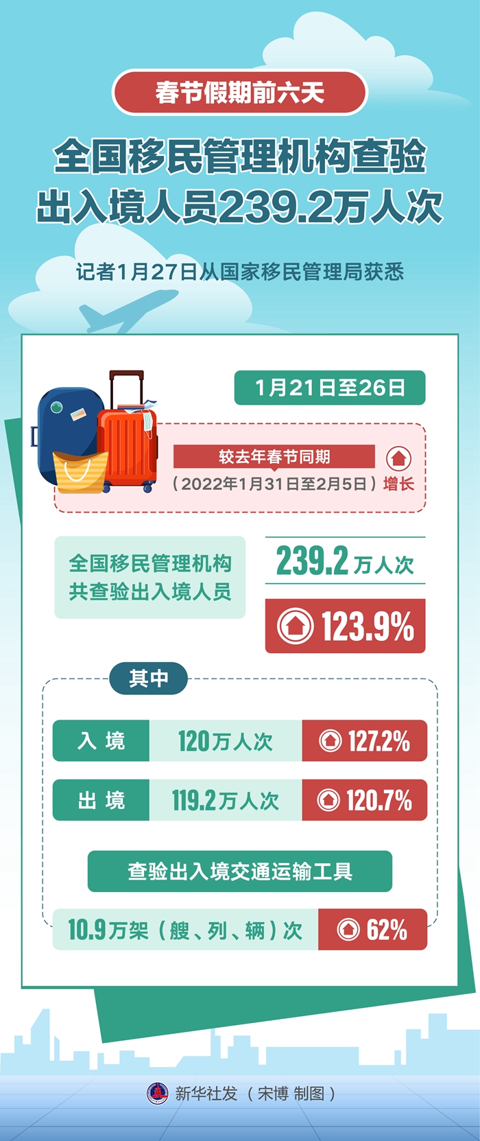 新华社北京1月27日电(记者任沁沁)记者27日从国家移民管理局获悉,1月21日至26日,全国移民管理机构共查验出入境人员239.2万人次,较去年春节同期(2022年1月31日至2月5日)增长123.9%。其中,入境120万人次,较去年春节同期增长127.2%;出境119.2万人次,较去年春节同期增长120.7%。查验出入境交通运输工具10.9万架(艘、列、辆)次,较去年春节同期增长62%。