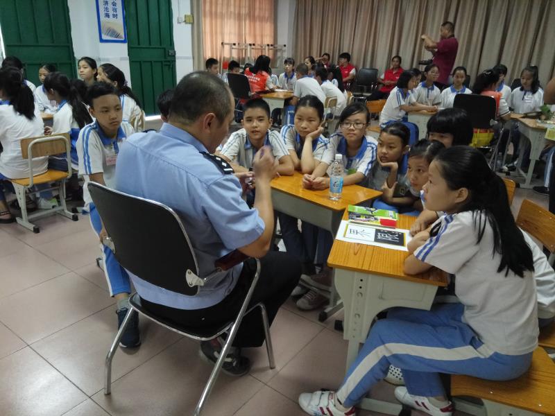 2016年9月,古暘阳(穿警服者)在东莞市德恩学校组织开展禁毒进校园活动。
